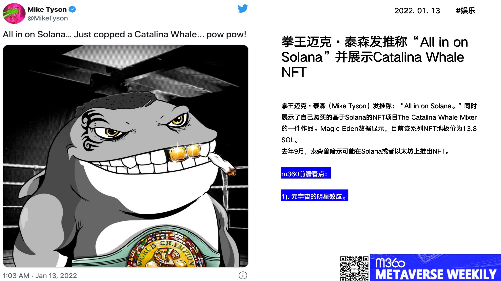 拳王迈克·泰森(Mike Tyson)发推称:“All in on Solana。”同时展示了自己购买的基于Solana的NFT项目The Catalina Whale Mixer的一件作品。Magic Eden数据显示,目前该系列NFT地板价为13.8 SOL。 去年9月,泰森曾暗示可能在Solana或者以太坊上推出NFT。