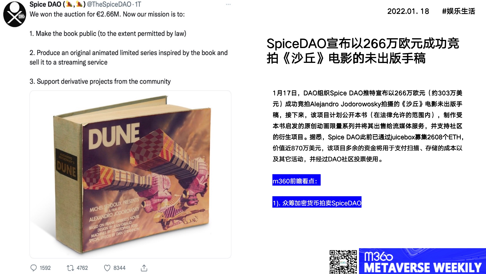 1月17日,DAO组织Spice DAO推特宣布以266万欧元(约303万美元)成功竞拍Alejandro Jodorowosky拍摄的《沙丘》电影未出版手稿,接下来,该项目计划公开本书(在法律允许的范围内),制作受本书启发的原创动画限量系列并将其出售给流媒体服务,并支持社区的衍生项目。据悉,Spice DAO此前已通过juicebox募集2608个ETH,价值近870万美元,该项目多余的资金将用于支付扫描、存储的成本以及其它活动,并经过DAO社区投票使用。