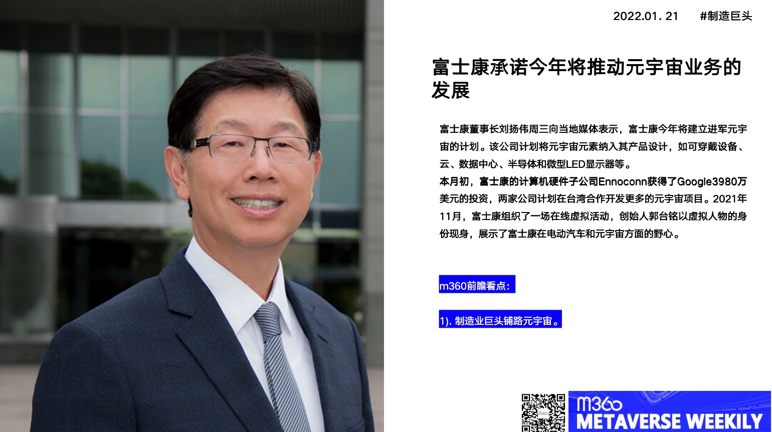 富士康董事长刘扬伟周三向当地媒体表示,富士康今年将建立进军元宇宙的计划。该公司计划将元宇宙元素纳入其产品设计,如可穿戴设备、云、数据中心、半导体和微型LED显示器等。 本月初,富士康的计算机硬件子公司Ennoconn获得了Google3980万美元的投资,两家公司计划在台湾合作开发更多的元宇宙项目。2021年11月,富士康组织了一场在线虚拟活动,创始人郭台铭以虚拟人物的身份现身,展示了富士康在电动汽车和元宇宙方面的野心。
