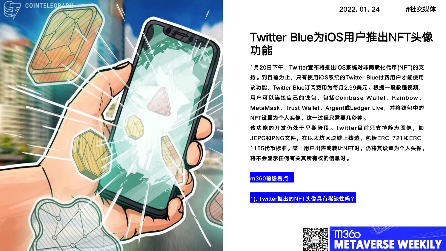 1月20日下午,Twitter宣布将推出iOS系统对非同质化代币(NFT)的支持。到目前为止,只有使用iOS系统的Twitter Blue付费用户才能使用该功能,Twitter Blue订阅费用为每月2.99美元。根据一段教程视频,用户可以连接自己的钱包,包括Coinbase Wallet、Rainbow、MetaMask、Trust Wallet、Argent或Ledger Live,并将钱包中的NFT设置为个人头像,这一过程只需要几秒钟。 该功能的开发仍处于早期阶段。Twitter目前只支持静态图像,如JEPG和PNG文件,在以太坊区块链上铸造,包括ERC-721和ERC-1155代币标准。某一用户出售或转让NFT时,仍将其设置为个人头像,将不会显示任何有关其所有权的信息时。