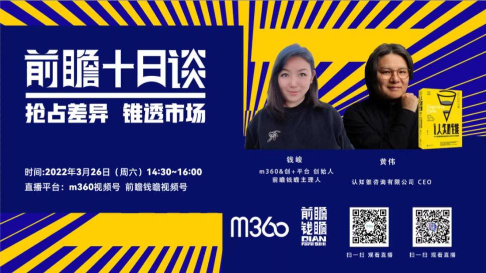 近日,M360前瞻钱瞻之《前瞻十日谈》栏目,M360&创+平台创始人、前瞻钱瞻主理人Christine钱峻邀请到认知锥战略定位咨询CEO黄伟,请他分享《认知锥》的创作背景和独特价值,以及他眼中的营销及市场趋势。