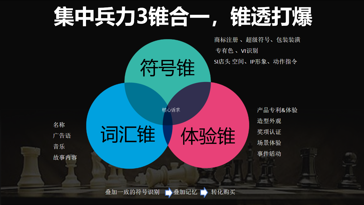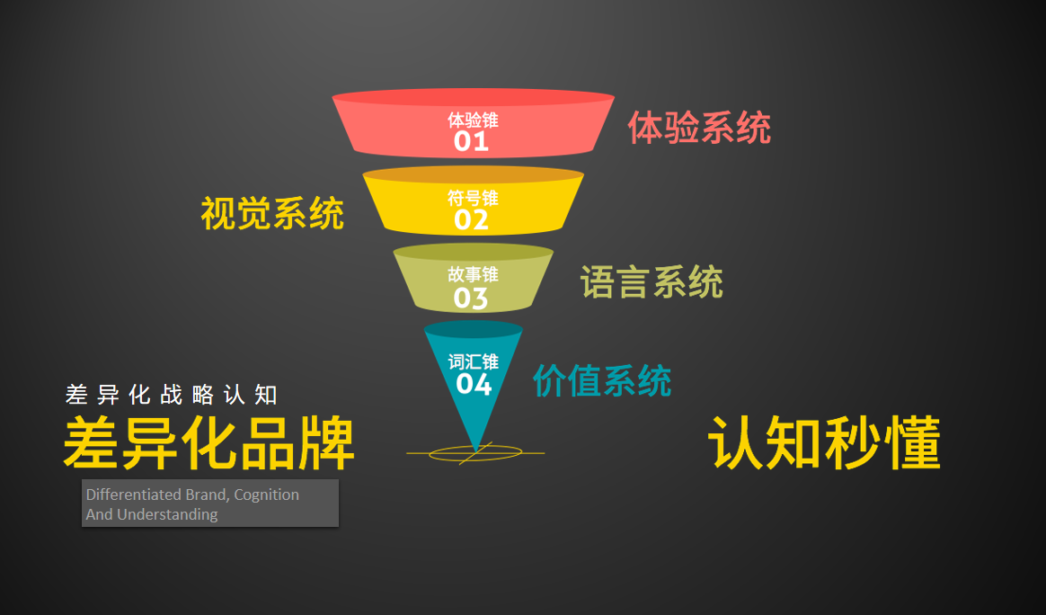 1、“认知锥”从定位、视觉、听觉、体验全方面入手,通过词汇锥、符号锥、体验锥的打造与重叠,帮助品牌和产品形成用户“认知秒懂”、提高有效转化,从而成功打造超级爆品。