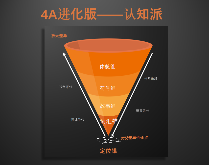 《认知锥》讲的就是抢占差异和放大差异,在本书里,抢占差异就是“词汇锥”。差异抢占完以后如何去放大,最基本就是用品牌logo和视觉符号把差异进行视觉化的转化,然后再通过故事又去放大原先的卖点。