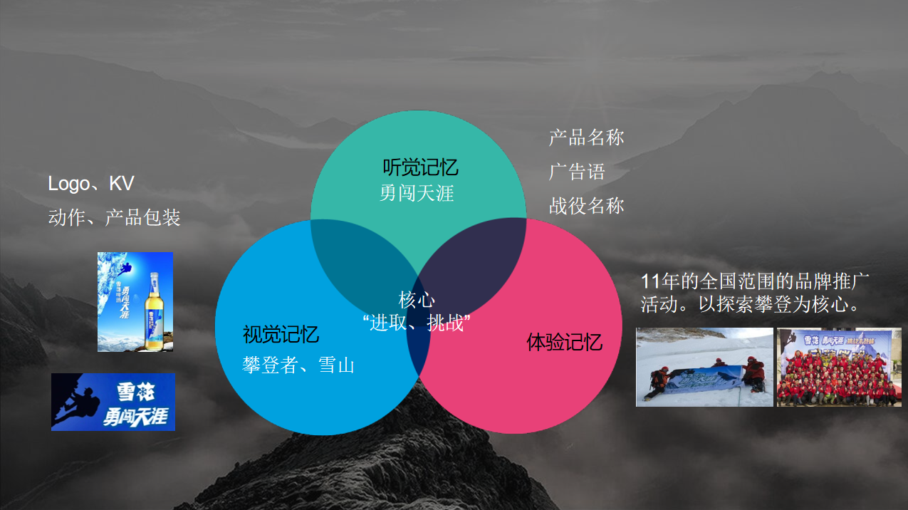 勇闯天涯啤酒是雪花旗下的,每年号召全国的大学生组成攀山营,去攀登中国的一座座雪山。故事讲的就是这群年轻人在攀登雪山过程中,产生的各种各样超越自我勇气,实现颠覆的故事。他把词汇锥、视觉锥、体验锥和故事锥紧紧合在一起,所以他一年只要做一项营销活动就可以了。