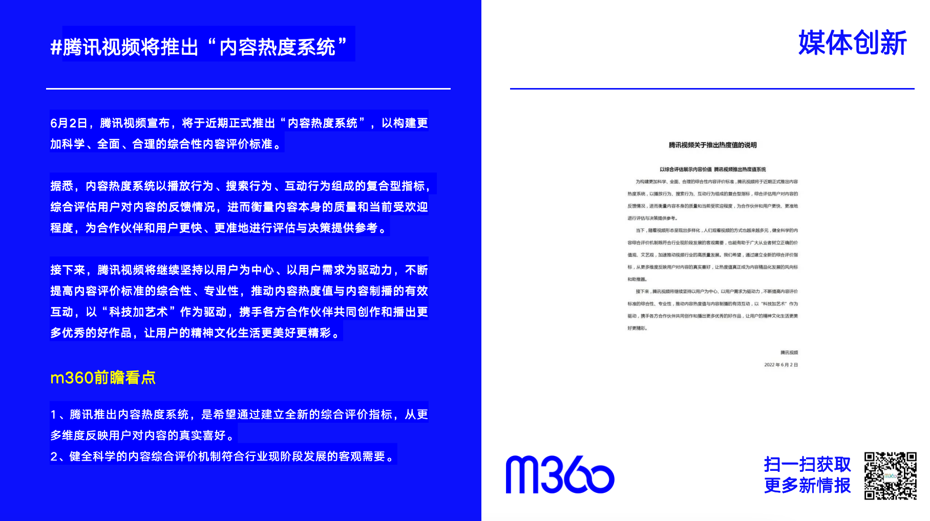 1、腾讯推出内容热度系统,是希望通过建立全新的综合评价指标,从更多维度反映用户对内容的真实喜好。