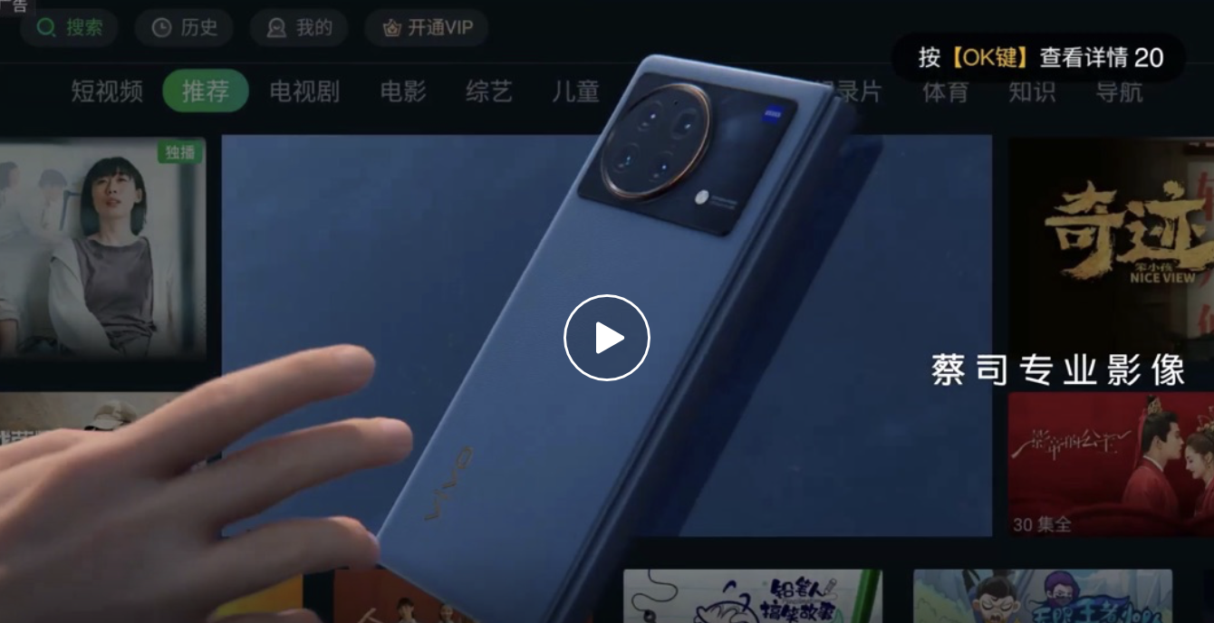 以爱奇艺与vivo的合作为例,在今年4月vivo首款折叠机X Fold上市期间,爱奇艺为其定制打造了OTT全屏巨幕聚光灯,在普通广告片的基础上,升级全屏破框的裸眼3D效果,完美契合X Fold折叠机型 “大,集大成”的产品理念,为观众提供视觉+听觉的双重完美感受,极有效提升消费者兴趣及品牌格调。