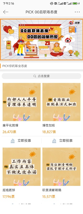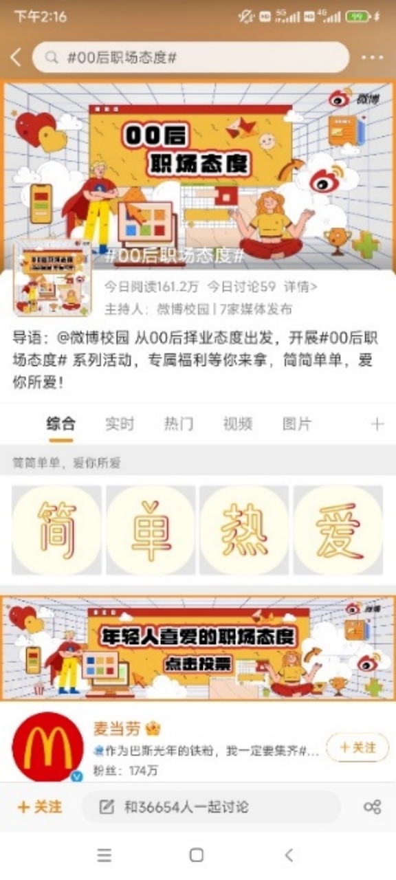 例如在话题页面,除了通过创意设计、TVC插片和安排@麦当劳 作为特约主持人增强品牌露出,还可以点击图片card直接进入“年轻人喜爱的职场态度”投票活动。而作为一个贯穿活动前后的投票活动,这不光持续吸引着年轻人对话题的关注,也达到了双向交流的目的,为话题运营提供了高质量物料。而衍生话题#欧阳娜娜说简单才够味#的话题页card,则能够直接跳转麦当劳小程序下单,提高用户转化效率。