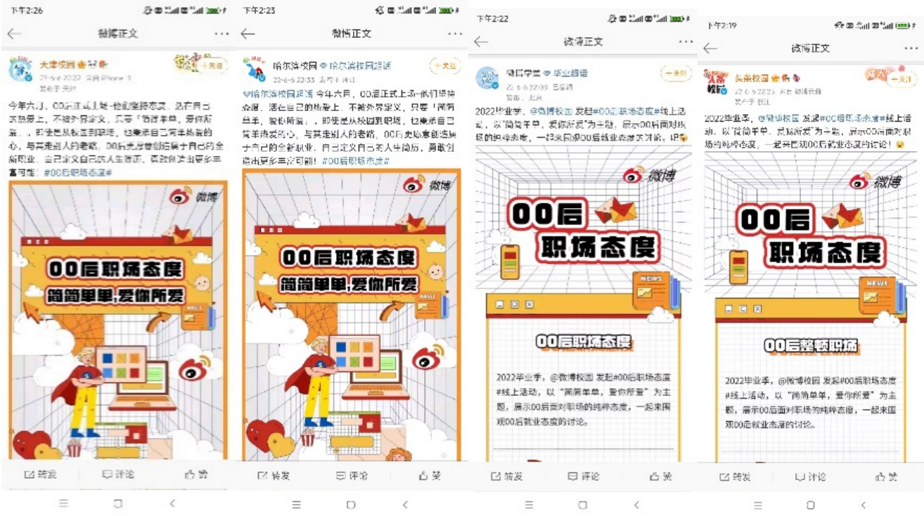 在传播初期可以看到,微博校园官方账号和高校蓝V账号组成的账号矩阵,邀请网友分享择业态度、职场初体验、价值观念等不同角度的内容,达到了“抛砖引玉”的效果,也获得了高校粉丝的准确回应,精准捕获了目标受众的注意力。