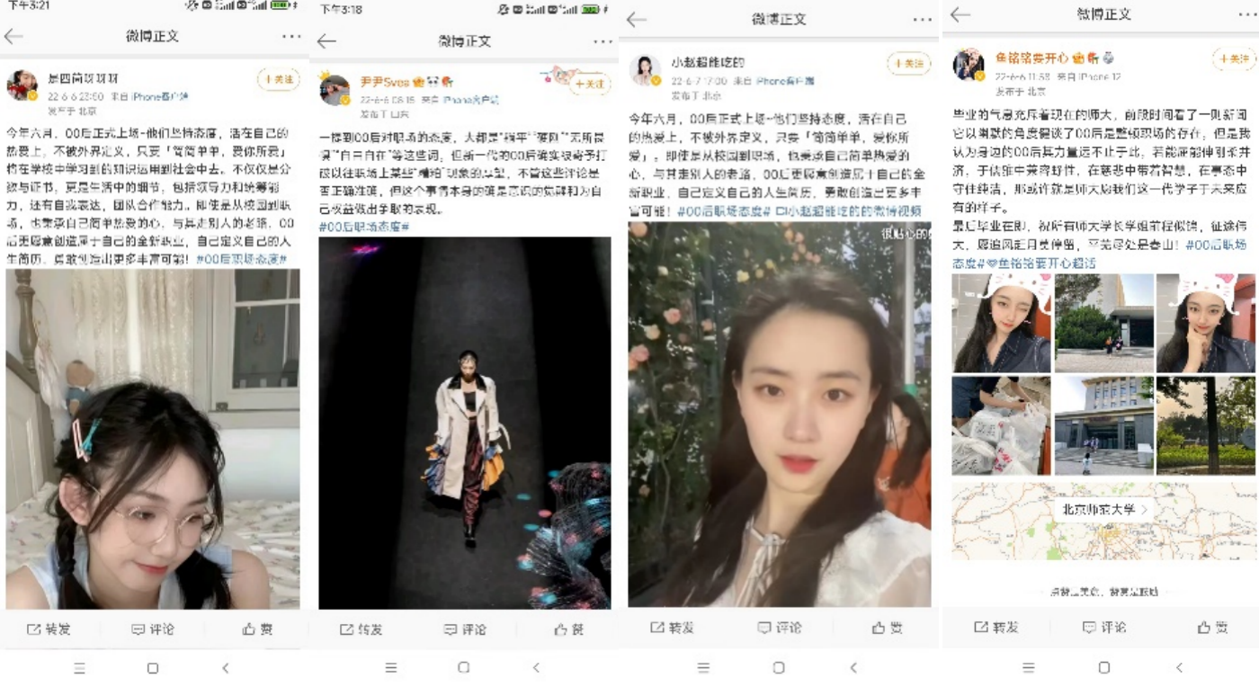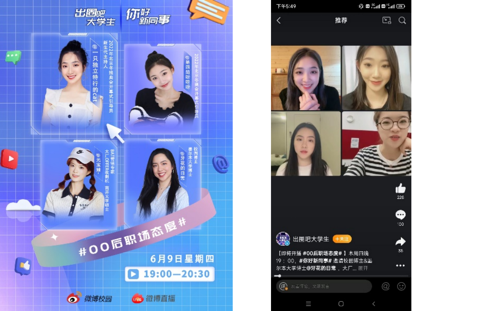 作为话题“气氛组”的校园博主,不只是通过个人微博账号向目标用户输出关于择业态度、职场初体验、价值观念的内容。在微博校园的组织下,来自海内外不同高校的四位校园博主,通过@出圈吧大学生 直播连麦,在线上分享职场态度与经验,也以最直接的形式参与到话题讨论中,在吸引粉丝持续关注话题的同时,形成了差异化的UGC产出。