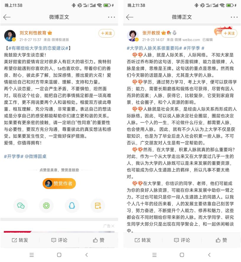 以2021年#开学季#活动为例,在主话题中,微博校园矩阵账号不仅通过“云开学典礼”、#开学季#超话等方式直达目标群体,还联动知名专家学者发起深度议题,并引入官媒机构协同推广,提升了传播高度和深度。譬如此前中国传媒大学张开教授、北京师范大学刘文利教授等领衔讨论的话题,都成为了师生们关注的热点。此类设置可谓一石激起千层浪,不仅能快速建立品牌认知,也能将专家学者与品牌方动态关联起来,为品牌方积累口碑资产。
