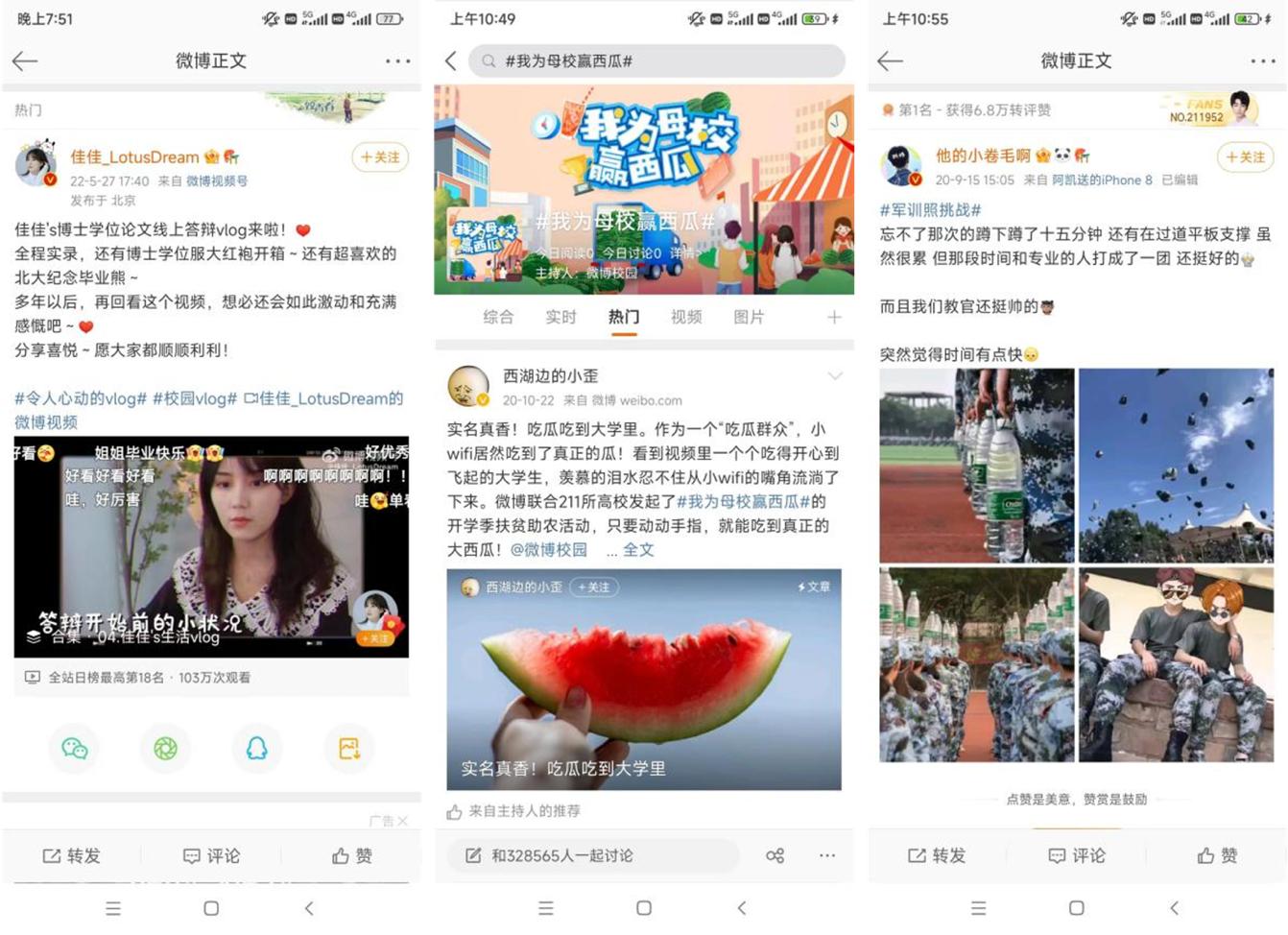 图:#校园VLOG#、#我为母校赢西瓜#、#军训照挑战#等子话题
