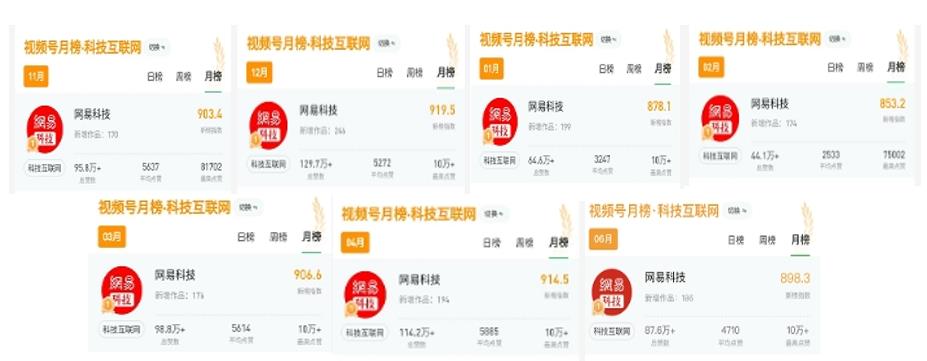 不仅如此,在过去8个月里,“网易科技”7次名列新榜新视排行榜“科技互联网”月榜Top1,84次登上新榜全领域视频号500强,产出近900条爆款视频,全平台视频播放量累计超30亿,视频号、快手、抖音等全平台粉丝增长超过百万。