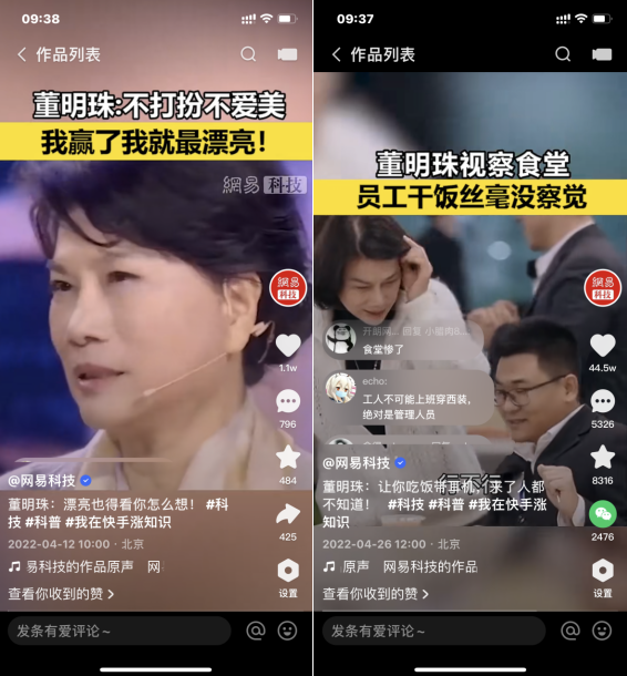 以董明珠的视频为例。董明珠是女强人,敢说,能说,说得足够接地气,本身就有很强的话题性,视频中涉及她的故事,流量往往都不错。但最近我们复盘时,发现两条董明珠500w播放量的卡段视频,相较先前100w级别的视频之所以能数据提高,核心就在于:视频中,我们不再聚焦于董明珠自己的表达,而是更多借助了她身边的人评价,从而更好地烘托董明珠的性格特点,让人物的特质更加鲜明,也赢得了观众更多的喜爱。