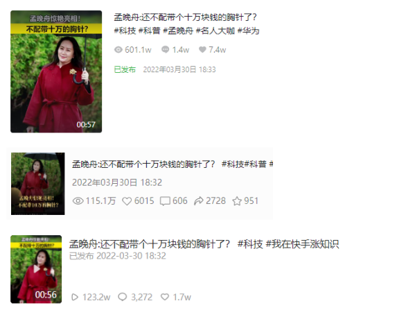 今年的3月28日,孟晚舟回国后首次亮相华为业绩发布会,我们迅速找到一个“清奇”切入点:胸口上那十万块的胸针。先不论,“英雄”人物与公众质疑如何拿捏,但在出镜人员全新的口播视频中,该短视频内容分别踩中了热点人物、热点公司、全新角度、情绪饱满等多个爆款规律。