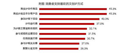 不曾想,雪糕也能成为文创的载体:从三星堆到黄鹤楼,从西安城墙到莫高窟,以景区人文景观或文物造型的文创雪糕席卷全国,成为景区宣传引流的亮点,很多人在景区手持文创雪糕拍照、打卡、发社交媒体,他们并不在意雪糕本身,而是对文创雪糕带来的内容抚慰感产生共鸣,代表着他们对传统文化原生魅力的认同和支持。本次调研显示,消费者通过多种方式来支持自己喜欢的文创IP,主要是购买IP联名商品、IP周边手办等产品和参加IP线下活动,分别占比45.3%、45.3%和40.3%。