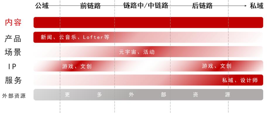 网易传媒就以内容为驱动,为品牌提供了新的内容玩家解决方案。网易通过全链路的不同节点注入内容去赋能营销,在前链路通过内容+云音乐、游戏等IP激发用户热爱与购买欲,中链路通过元宇宙等场景创造新体验,后链路通过内容+服务的强互动激活用户关系,为品牌和用户搭建双向连接的平台,打通营销通路,从而形成公域到私域的转化。