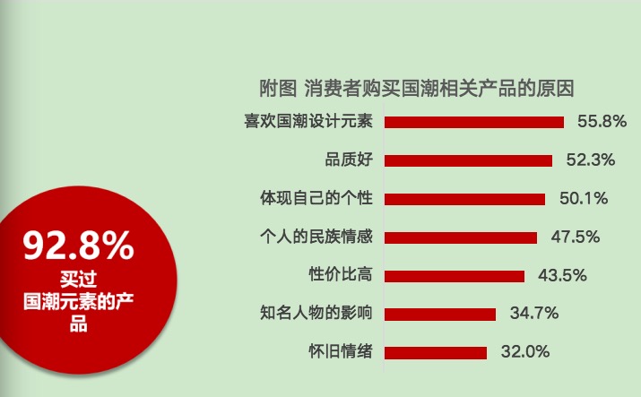 中国李宁、故宫文创产品、花西子等一系列国货化妆品的崛起,是中国文化自信的提升,也是年轻一代消费者对于“国潮”热爱的体现。年轻人对于国潮的喜爱到达了顶点,其背后的原因是国潮应用传统文化的焕新,帮助年轻人进行了自我的表达,满足了他们的精神需求。如报告调研显示,92.8%的消费者购买过国潮元素的产品,其中,50.1%的年轻消费者购买国潮产品是因为可以体现自己的个性。