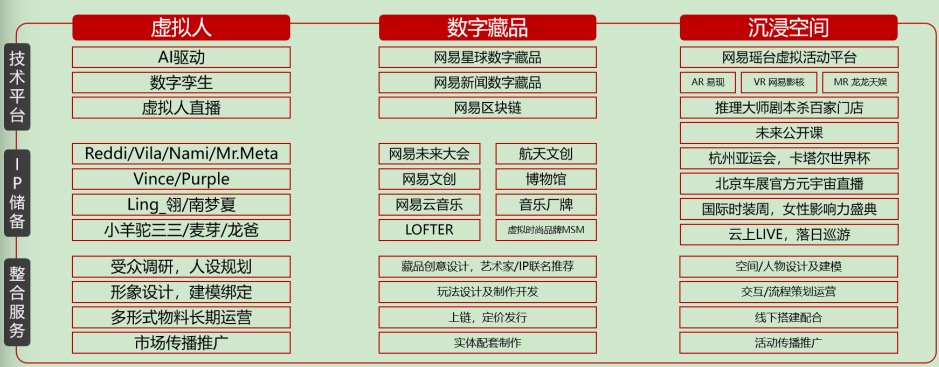 在此情境下,网易提出了“全景”式营销,就是立足在雄厚的技术和内容优势上,为品牌提供元宇宙“人、货、场”的全面营销赋能,实现数字化营销新触点的连通。具体来看,网易为品牌准备了三把链接元宇宙的“钥匙”——虚拟数字人、数字藏品、沉浸空间,从内容生态的打造,到元宇宙营销的布局,网易对于内容生态矩阵也在逐步完善。