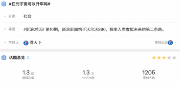 优质内容搭配精准的媒介才是传播生态中的强力组合。依托于微博平台的社交媒体属性,新浪新闻以#在元宇宙可以开车吗#为话题,从内容出发,结合节目主题在微博建立了新的社交媒体传播场域,这让优质热点话题和优质内容获得在社交网络中的传播性,品牌也实现了从节目受众到全网精英人群。