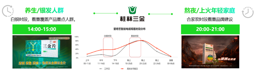 针对广告主的诉求,奇异果TV推出了“时段包断”的投放策略,在指定时段中,品牌可以在用户观看的所有视频中前贴片的位置出现,实现了品牌在目标用户群体中最大化的可见性,对品牌认知和购买行为起到非常强的导向作用。医药品牌桂林三金,在推广旗下不同功能定位的细分产品时,就采用了时间包段的打法,让目标用户群“打开即可见”。