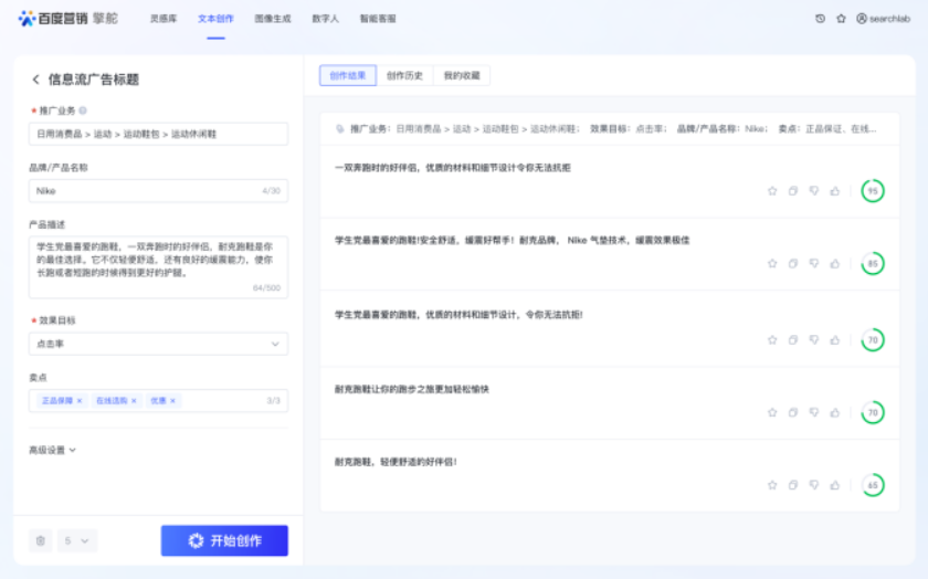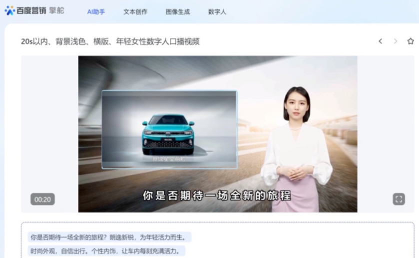 当前来看,营销行业是生成式AI的“先行示范区”。近日,M360关注到一条demo视频,国内AI营销领域“头号种子选手”——百度营销旗下的AIGC营销创意平台“擎舵”,在短短几分钟内,就能够为上汽大众朗逸新锐的新品定制生成文案和数字人口播视频并进行上线投放。