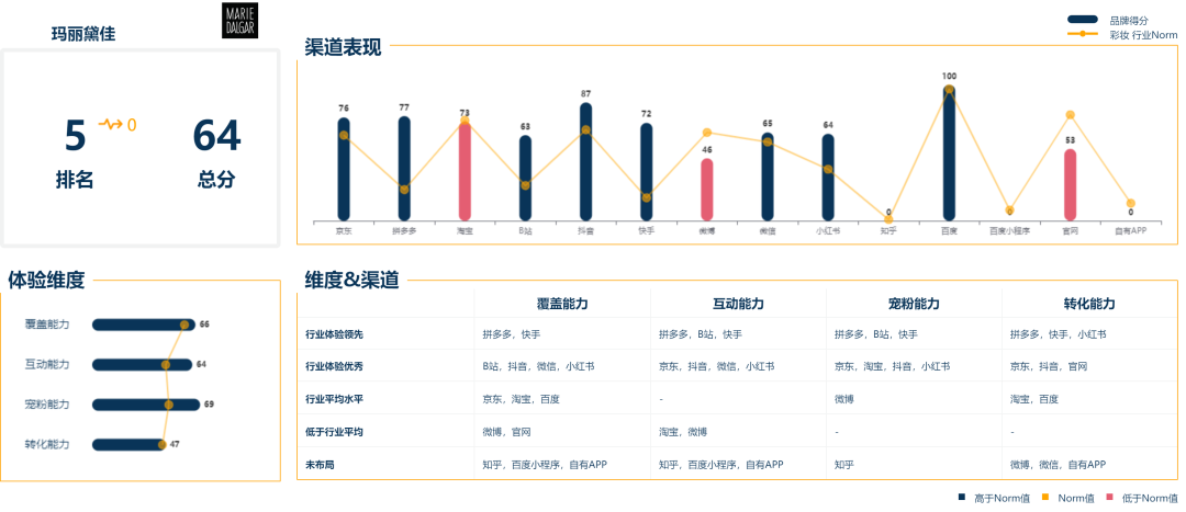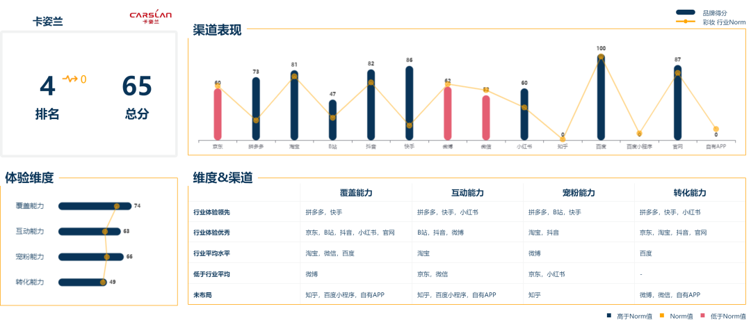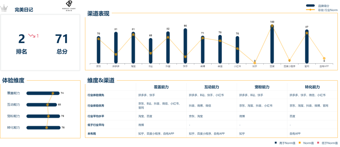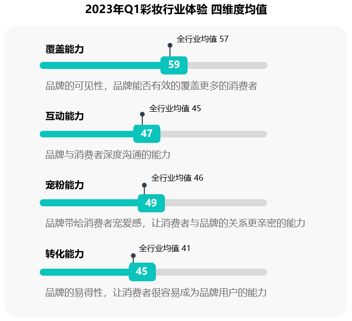 彩妆行业在四个维度上相对于整个行业表现较为平衡,其四项能力均高于全行业平均水平。