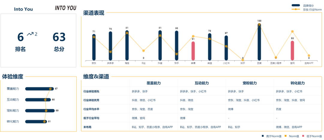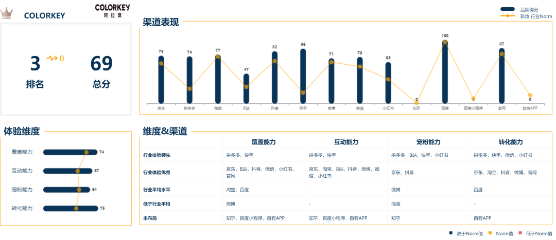 与上一季相比,彩妆行业的覆盖能力有所提升,排名在全行业中提升了5位。互动能力表现相对稳定,而宠粉能力和转化能力则稍有退步,排名分别下降了3位和1位。品牌需要持续观察这些变化,并根据具体建议进行相应调整。