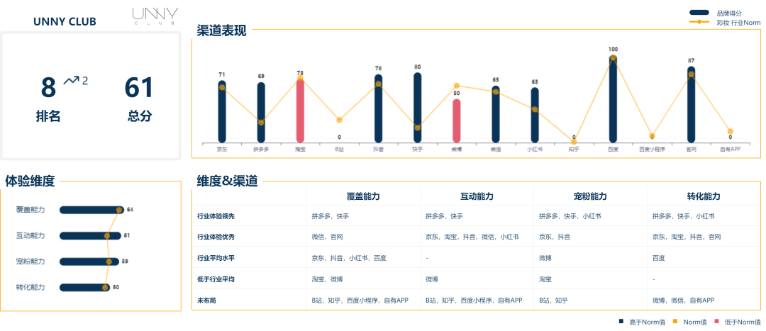 彩妆行业排名第8是『UNNY CLUB』,品牌排名相对上一期上升2名,品牌体验得分为61分。