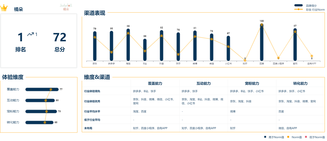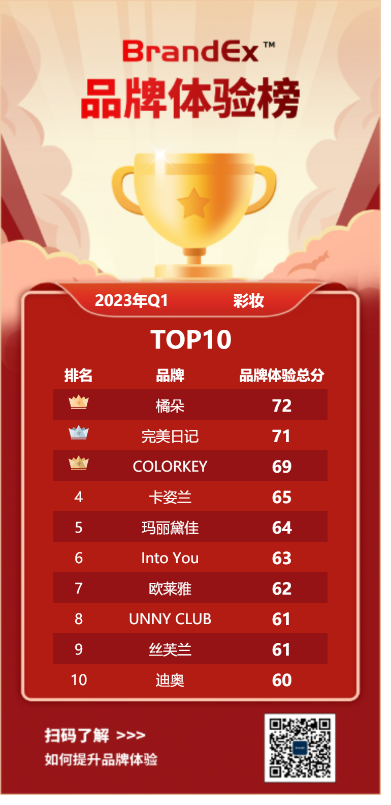 彩妆行业排名第1是『橘朵』,品牌排名相对上一期上升1名,占据该行业榜首,品牌体验得分为72分。