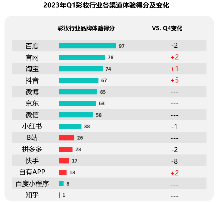 其中,抖音是增长最多的渠道,相较上一期得分增加5分;快手是体验下降最多的渠道,得分减少8分,目前低于全行业均值3分,需针对其表现进行行动。