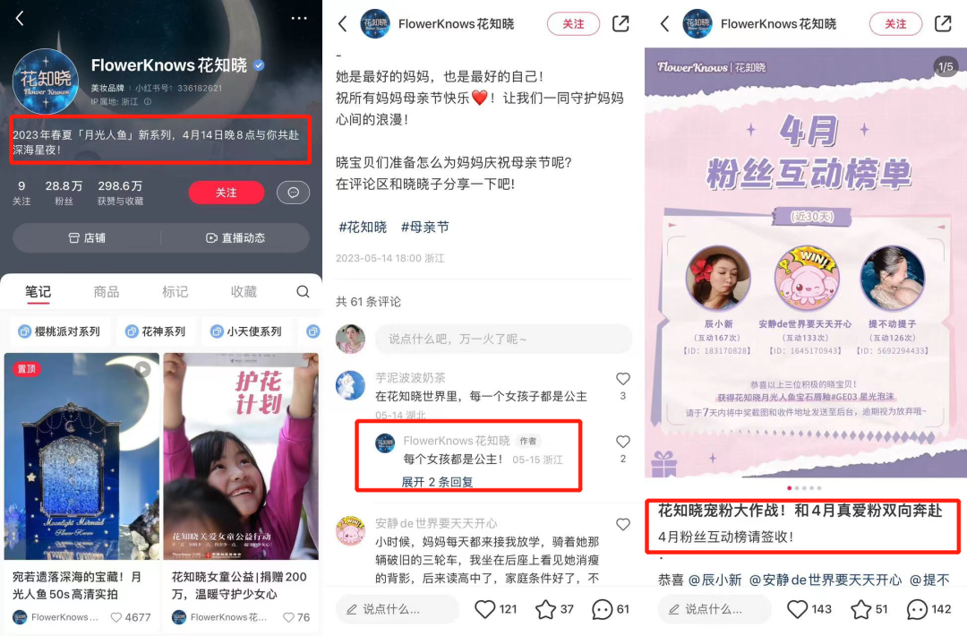如小红书渠道体验第一的品牌花知晓,将小红书打造为品牌的“朋友圈”,在评论区与用户互动,让消费者可以分享彼此的美妆心得、交流经验,并与品牌保持密切联系。同时采取“闺蜜感”的内容营销,根据节点发布话题,针对不同的用户群体进行不同的推广策略,设置抽奖、挑战、优惠礼赠等互动,吸引用户参与,提高品牌曝光