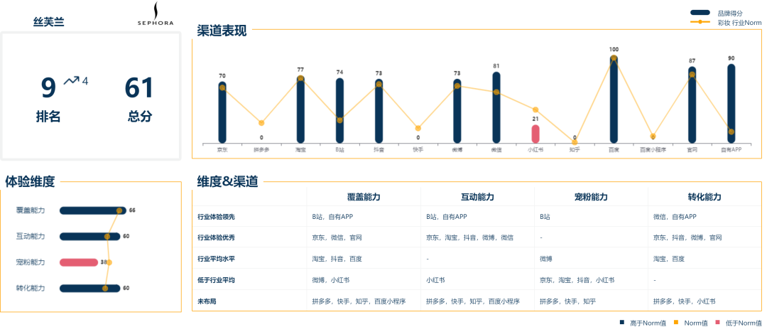 彩妆行业排名第9是『丝芙兰』,品牌排名相对上一期上升4名,品牌体验得分为61分。.png)