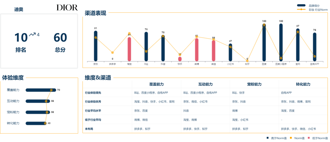 彩妆行业排名第10是『迪奥』,品牌排名相对上一期上升4名,品牌体验得分为60分。