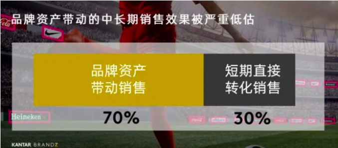 全行业也在重新审视品效关系,并逐渐认可品牌建设对长期效果转化的贡献。凯度做了360个TMROI (Total Marketing Revenue of Investment)的研究,结果显示:品牌资产所带动的中长期销售效果被严重低估了,所有销售中,70%的销售是在中长期发生的,由品牌资产贡献。