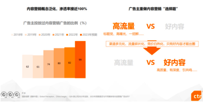 根据CTR广告主调查报告,2023年内容营销渗透率已接近100%。面对渠道多元化、流量碎片化、竞价白热化的市场环境,广告主重做内容营销“选择题”,从“卷流量”到“卷内容”,回归内容本质。高质量、有深度、引共鸣的“好内容”,日益受到广告主青睐。