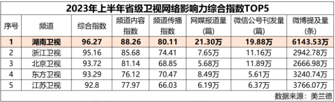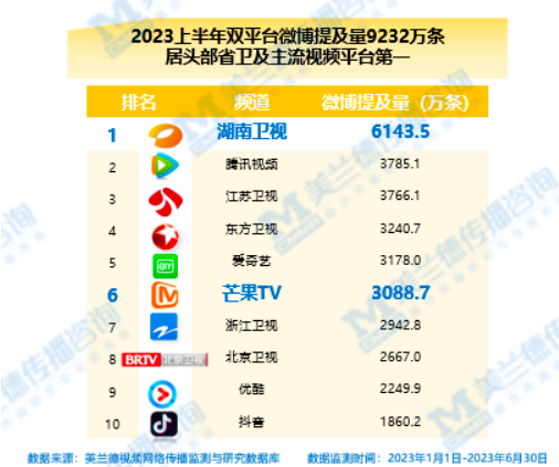 一直以来,芒果都是最具传播辐射力与裂变力的内容平台,引领文化传播潮流风向。2023年上半年,湖南卫视中国视听大数据(CVB)取得144天省卫第1,创近年来最好成绩;湖南卫视网络影响力综合指数第1,且在网媒报道、微信刊发、微博热议等多维数据第1;湖南卫视社交平台话题引爆力居头部省卫及主流视频平台第1,双平台加持下热度更盛,微博提及超9000万条,远远超出第二位。