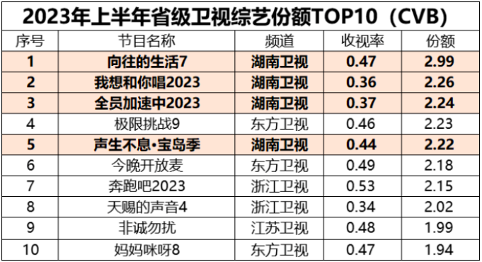 再来看IP影响力,2023年上半年,芒果综艺持续“霸榜”:CVB省卫综艺榜单中,湖南卫视前五占四,不断刷新收视纪录;美兰德全网热播综艺融合传播指数TOP10中,芒果双平台占据五席;包括《你好,星期六》、《向往的生活7》、《声生不息·宝岛季》、《乘风2023》等多赛道热播节目融合传播影响力,长期位列同类节目第一。