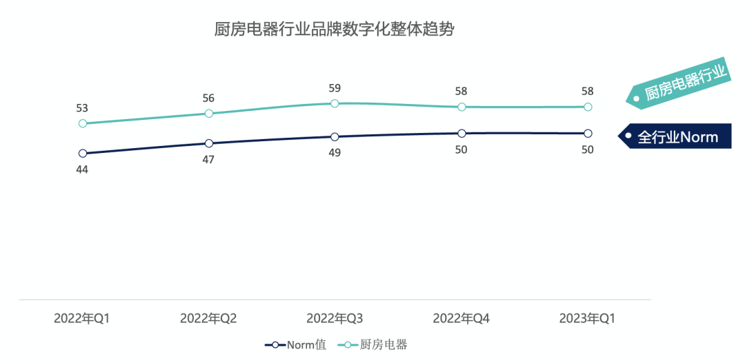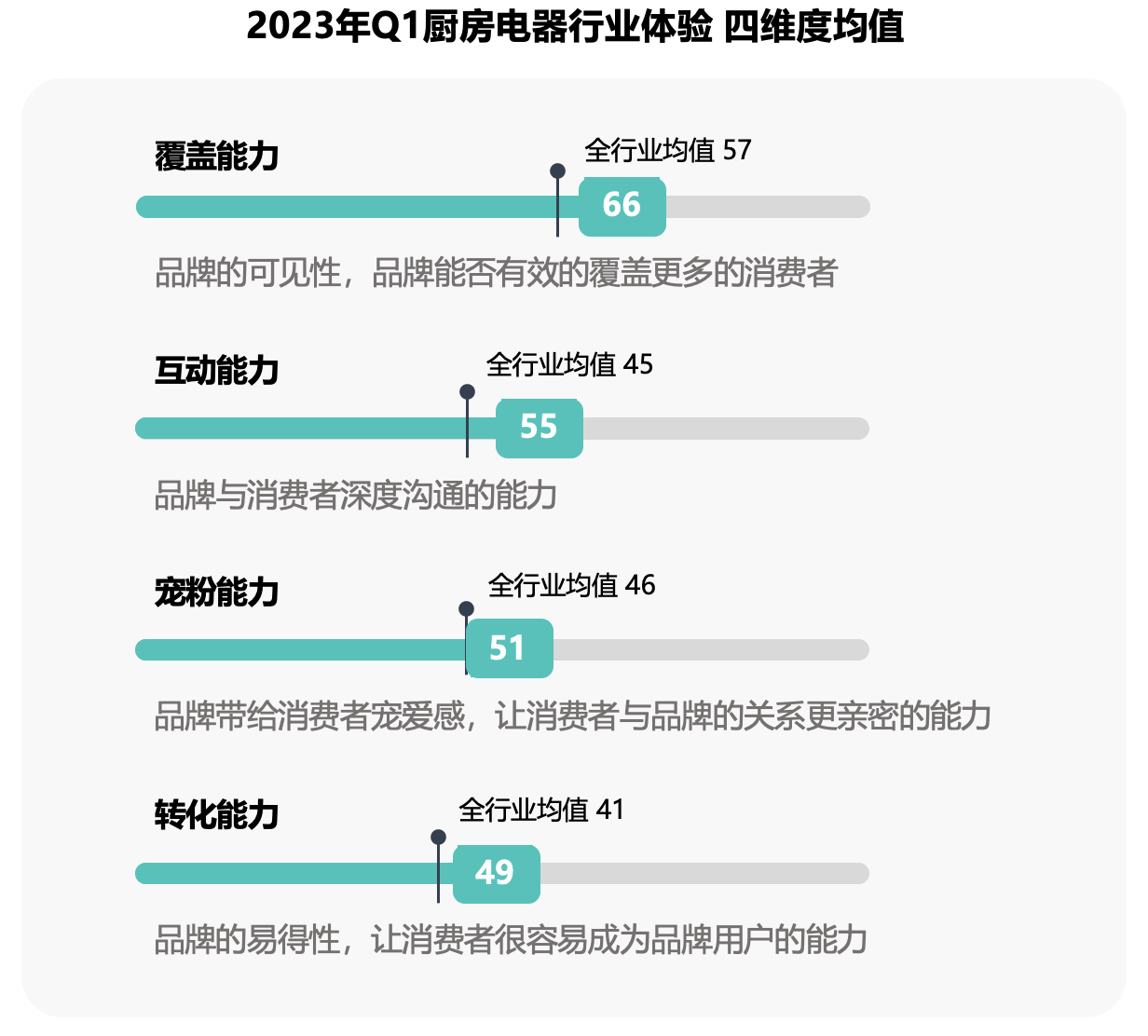 品牌维度能力可以反映多角度的品牌市场表现,对企业的营销管理和决策优化有重要意义。2023年Q1的品牌体验数据显示,厨房电器行业在四项能力上均超越全行业水平,展现出优秀的行业数字化体验。