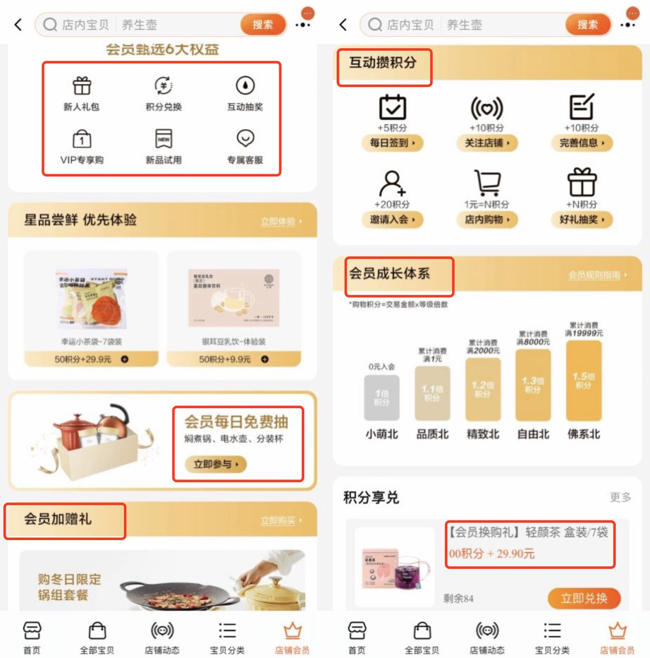 会员活动对品牌数字化体验的建设有重要作用,如新会员入会礼包,限时抽奖,满减优惠,积分兑换等。这些品牌给予粉丝的独宠优惠可以激励更多潜在消费者成为品牌的会员,享受更多的优惠和服务。