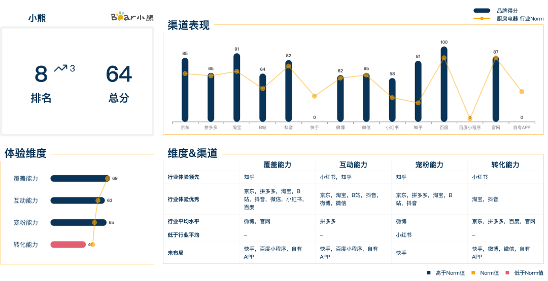 厨房电器行业排名第8是『小熊』,品牌排名相对上一期上升3名,品牌体验得分为64分。