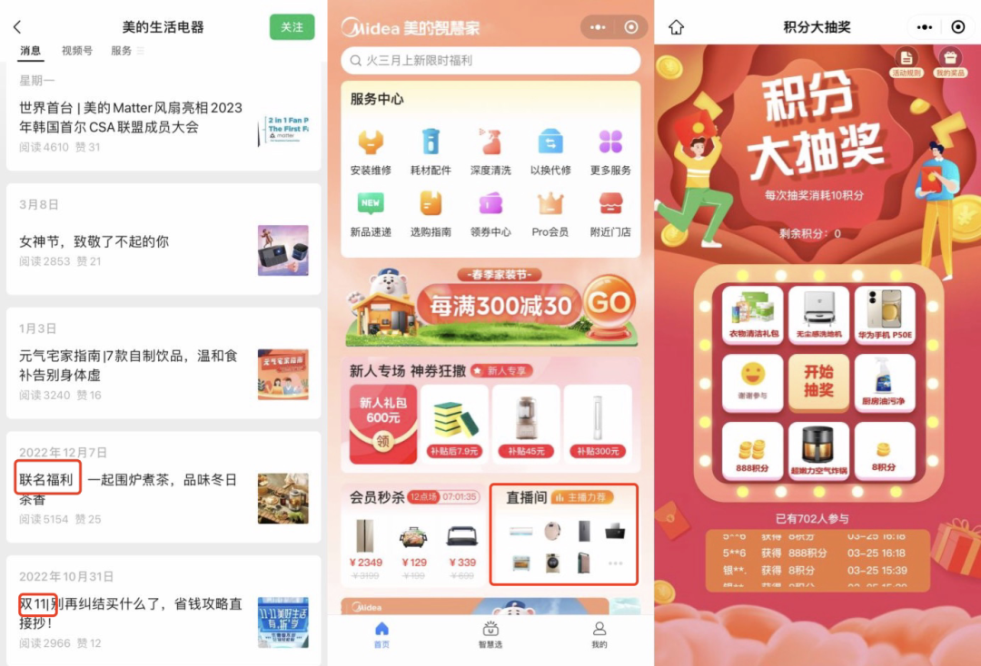 此外,厨电各品牌增强了微信渠道各功能的联动,公众号推送、视频号等都有关注与获赞的增加,小程序的也有所完善,如在小程序首页设置优惠、活动或游戏互动等,以此增加品牌与用户之间的互动频次和强度。让用户在与品牌互动过程中,获得更多的价值、乐趣、奖励,与品牌产生更多的共鸣、共识、共赢,增加用户对品牌的认同感和归属感。