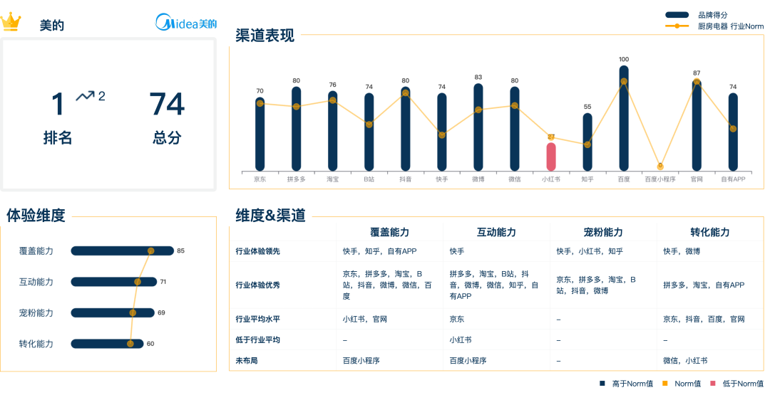 厨房电器行业排名第1是『美的』,品牌排名相对上一期上升2名,占据本期榜单第一,品牌体验得分为74分。