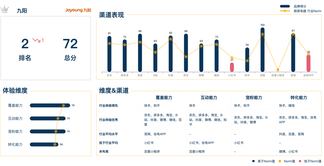 厨房电器行业排名第2是『九阳』,品牌排名相对上一期下降1名,品牌体验得分为72分。