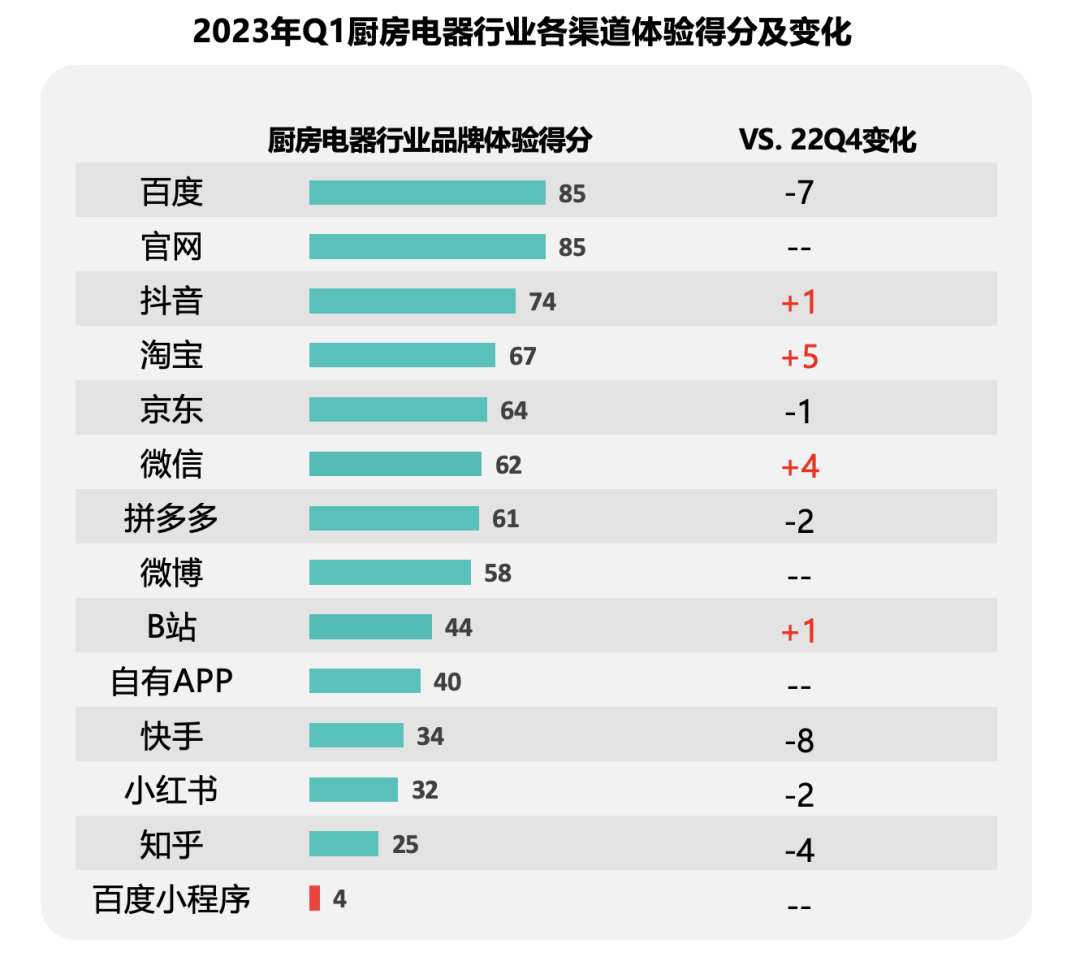 此外,也有43%的渠道体验出现了下降。「快手」和「百度」渠道的得分下降幅度相对较大,分别达到了-8分、-7分。部分厨电品牌对这两个渠道的官方账号的维护较差,内容生产及转化链路,没能给消费者带来稳定的体验。