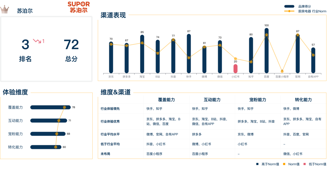 厨房电器行业排名第3是『苏泊尔』,品牌排名相对上一期下降1名,品牌体验得分为72分。
