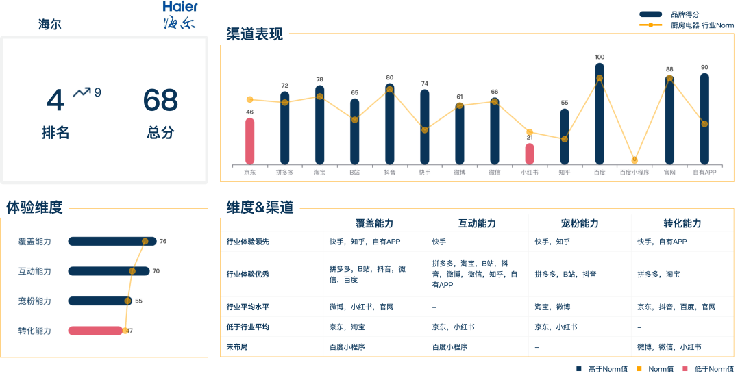 厨房电器行业排名第4是『海尔』,品牌排名相对上一期上升9名,品牌体验得分为68分。