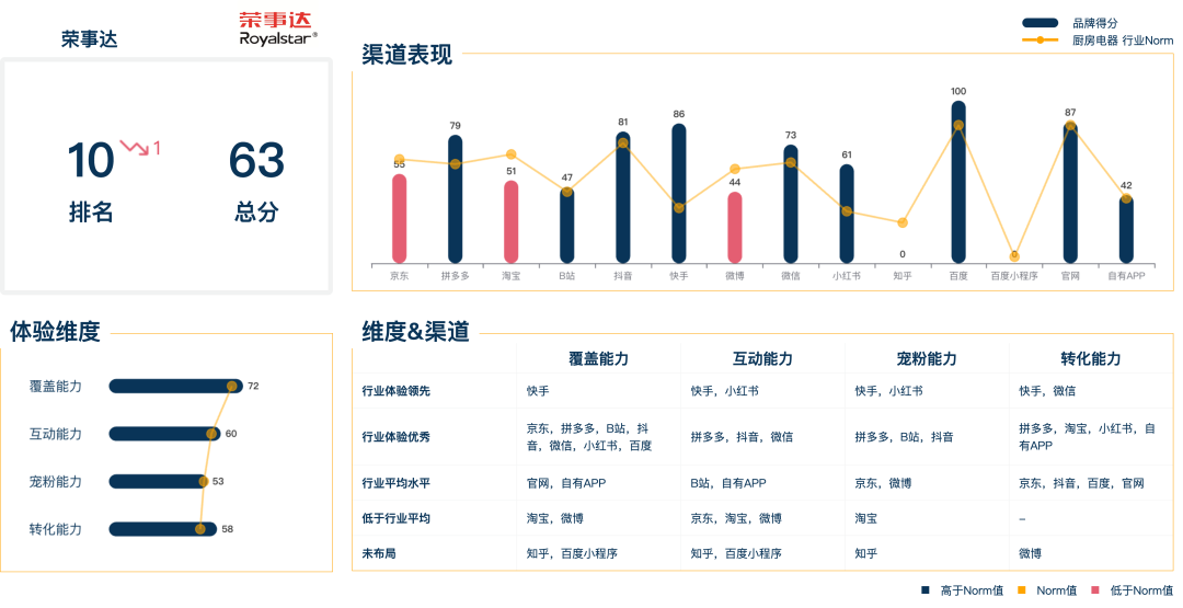厨房电器行业排名第10是『荣事达』,品牌排名相对上一期下降1名,品牌体验得分为63分。
