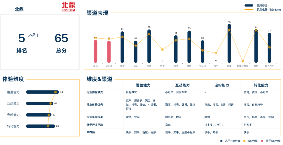 厨房电器行业排名第5是『北鼎』,品牌排名相对上一期上升1名,品牌体验得分为65分。