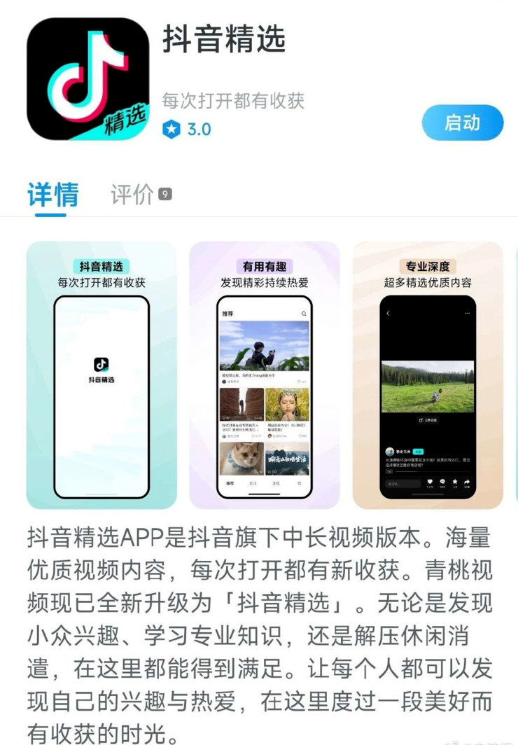 “青桃”在最新的 2.0.0 版本更新中,已经正式更名为“抖音精选”,图标也换为了抖音官方标志 +“精选”下角标。