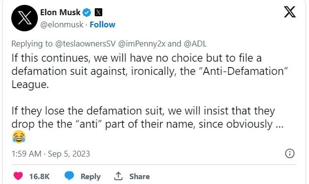 4、马斯克发文怒怼反诽谤联盟 导致X广告营收下滑的元凶